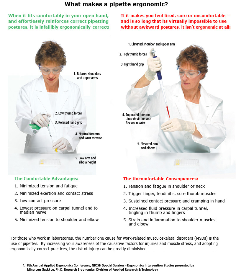 為了“符合人體工程學(xué)的正確”,傳統(tǒng)移液姿勢(shì)的重大變化是必不可少的 - 例如**小化前臂和手腕旋轉(zhuǎn),保持低臂和肘部高度,以及放松肩膀和上臂。當(dāng)使用具有細(xì)長軸向設(shè)計(jì)的移液器時(shí),這幾乎是不可能的。
