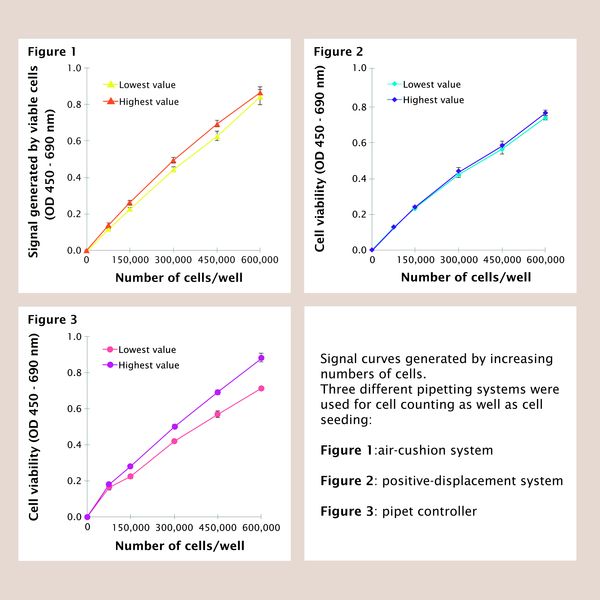 細胞接種的再現(xiàn)性隨使用的移液系統(tǒng)而變化。該圖顯示了相對于氣墊移液管(黃色),正位移系統(tǒng)(藍色)和移液管控制器(紅色)的種子細胞數(shù)的活細胞信號。